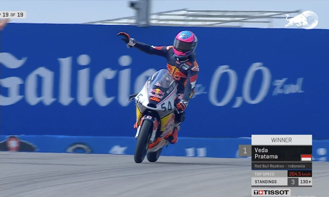 “Saya tidak menyangka bisa menang hari ini, tapi saya selalu percaya diri. Sejak awal balapan, semua pembalap saling menyalip, jadi saya coba tetap tenang dan bertahan di grup depan,” ujar Veda dalam rilis resmi Red Bull Rookies Cup.